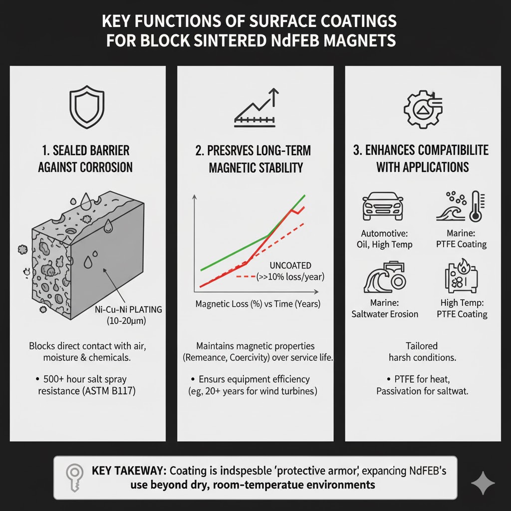 يعمل طلاء السطح بمثابة "درع وقائي" مصمم خصيصًا لنقاط الضعف في Block Sintered NdFeB، مما يؤدي إلى ثلاث وظائف أساسية لا غنى عنها للاستخدام العملي.