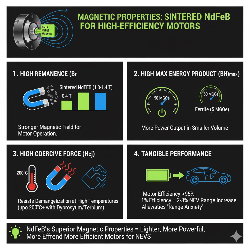 الميزة الأساسية لمغناطيس NdFeB الملبد تنبع من خصائصها المغناطيسية الاستثنائية، والتي تشكل الأساس لمحركات NEV عالية الأداء. تتكون بشكل أساسي من النيوديميوم (25%-35%)، والحديد (65%-75%)، والبورون (حوالي 1%)، كما أن هيكلها البلوري رباعي الزوايا الفريد يمنحها قدرات مغناطيسية تفوق بكثير المواد التقليدية.